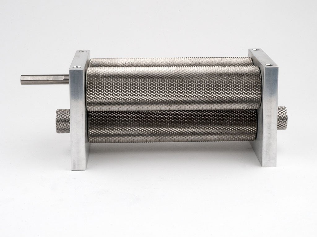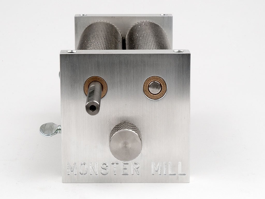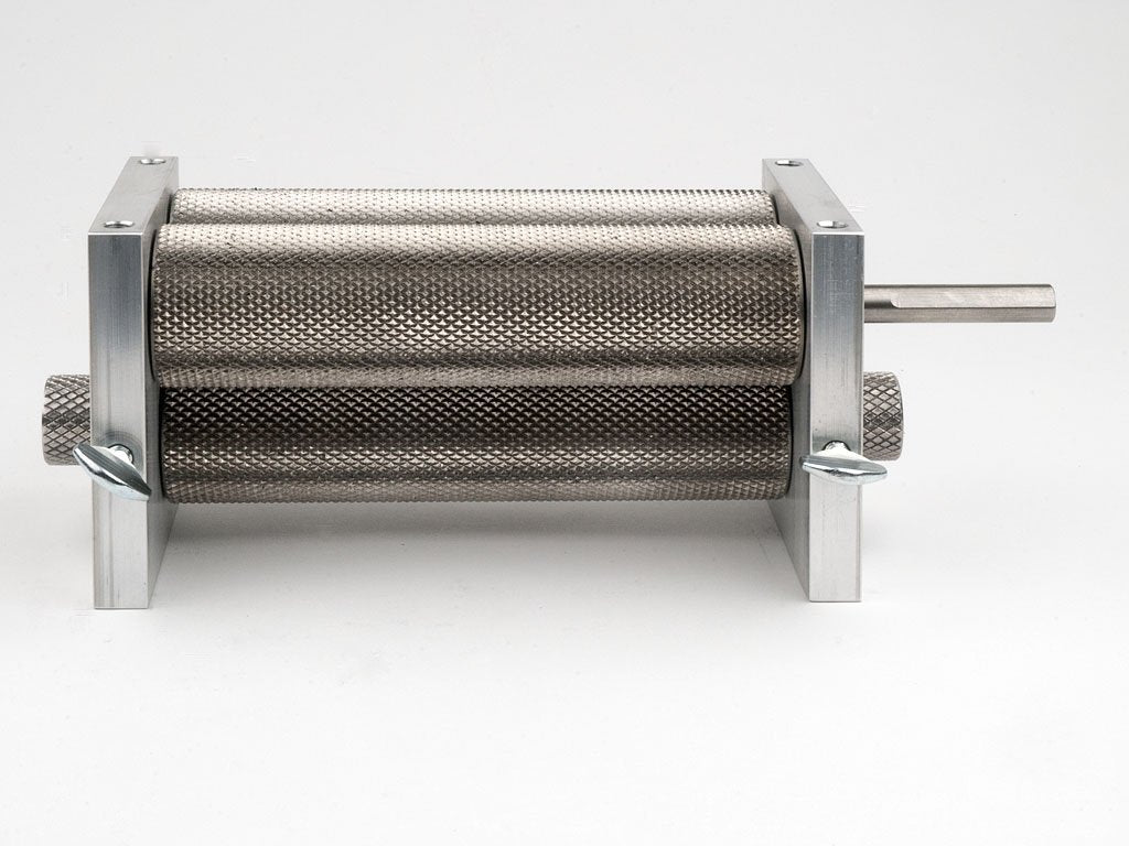 One knurled steel roller is driven by a standard electric drill (not included) to feed the grain through the initial fixed gap of approximately .065", and then through the adjustable secondary gap and crush the grist. Both ends of the non-driven top idler roller ride in bronze bushings that are pressed into the frames, while the second idler roller rides in bushings that are offset mounted in an adjustable knob. The knob is held in a fixed position by a set-screw that you can loosen to adjust the mill. This system provides an adjustment range of .070". Our knobs are made from 303 stainless steel for excellent durability, and are larger in diameter than the competition, as well as knurled for a positive grip. We've also added a groove in our newest design knobs with a matching rounded head on the thumbscrew that allows for a much better grip on the knob to avoid gap changes while milling, and also providing knob retention.