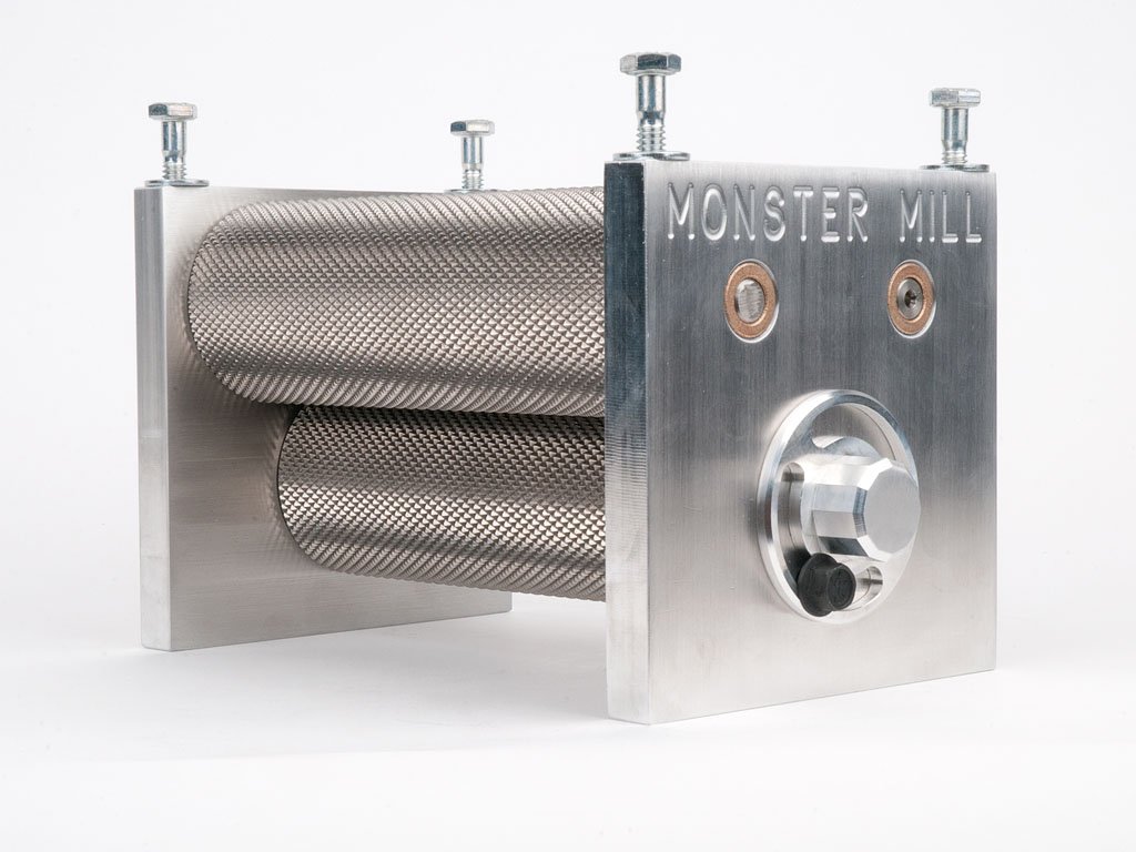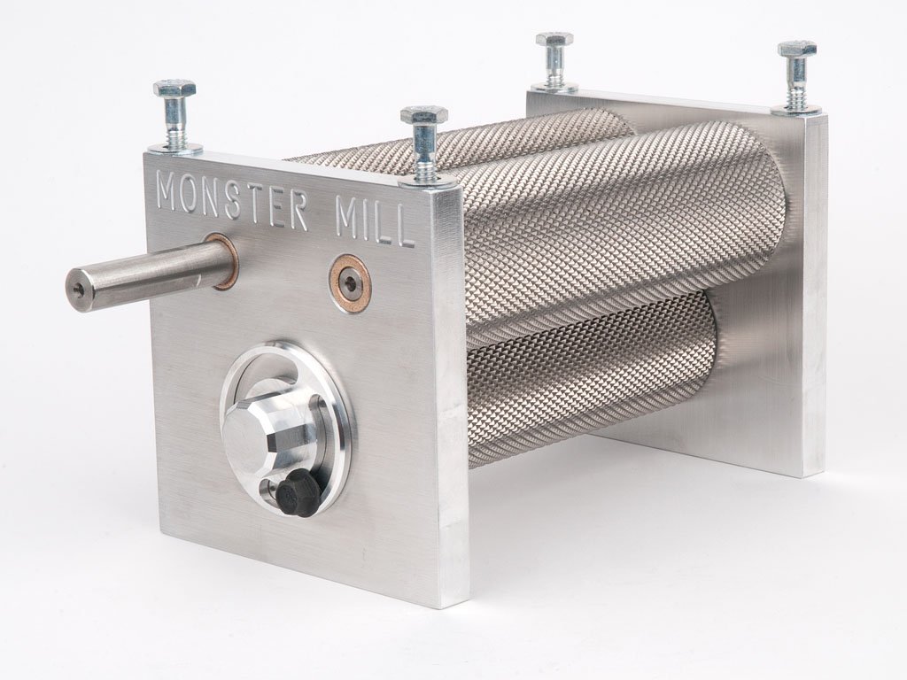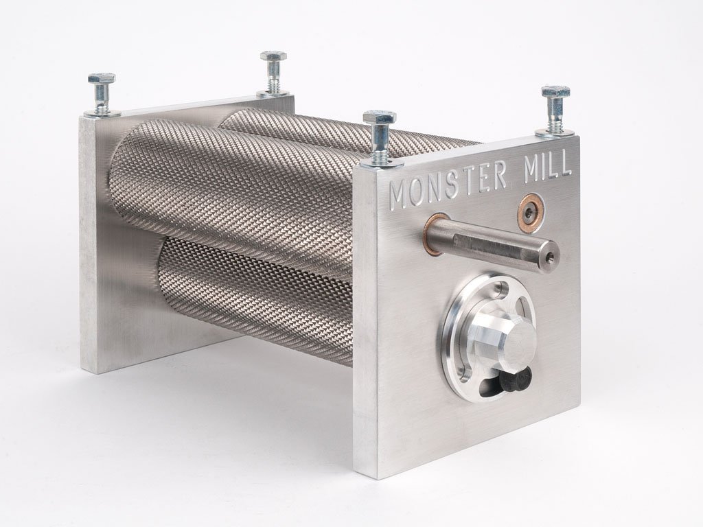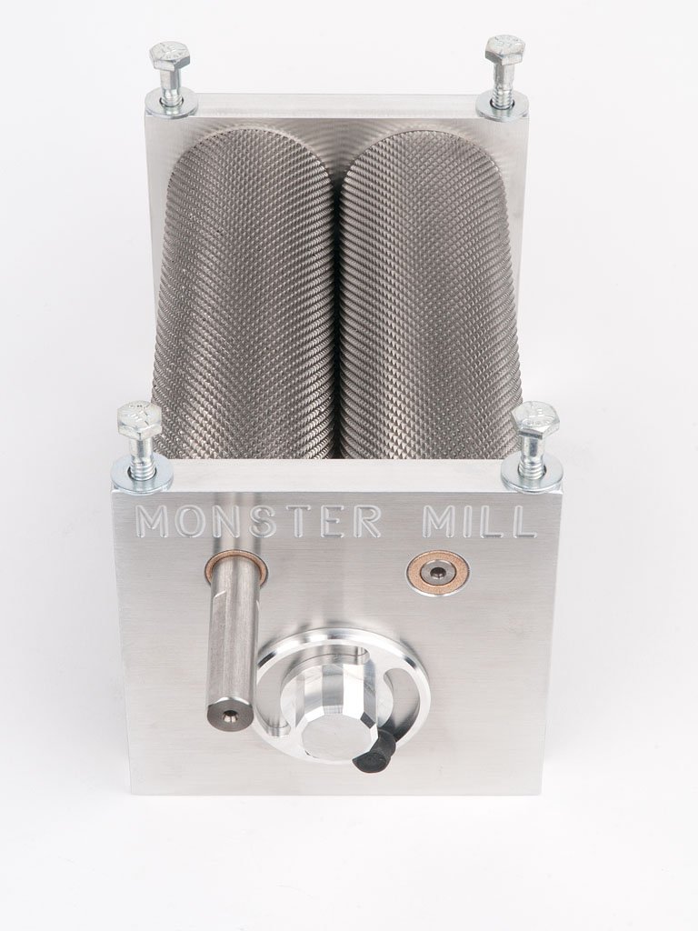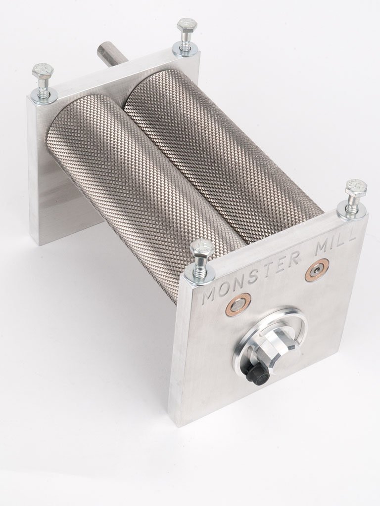 Introducing the largest in our line of 3-Roller Monster Mills, The MM3-Pro. This is a massive upgrade to our already excellent MM-3 mill meant to compete and win against the best home brew mills. The Pro model upgrades the rollers to 2" diameter steel, adds the billet aluminum knobs, as well as the 1/2" drive shaft as standard. We've taken the already great MM-3 mill, and added our new knob adjustment mechanism, AND 2" diameter rollers. You think to yourself that adding only 1/2" in diameter doesn't add that much, but I'm telling you that this mill is SUBSTANTIAL! More than you really, need, but exactly what you WANT. These rollers have girth, as well as length, 6" to be exact. With all the great features of our already popular MM-3, but super sized with 2" diameter rollers, and our new non-slip adjustment mechanism. The MM3-Pro crushes all your grain twice, with one pass through the mill. It starts with a preliminary crush through the initial fixed gap between the top two rollers, and then ends with a pass through the second gap between the drive roller, and the bottom third roller. The initial pass slightly flattens the grain, and gets it ready for the next crush, that breaks apart the grains and loosens the starch with minimal husk damage.