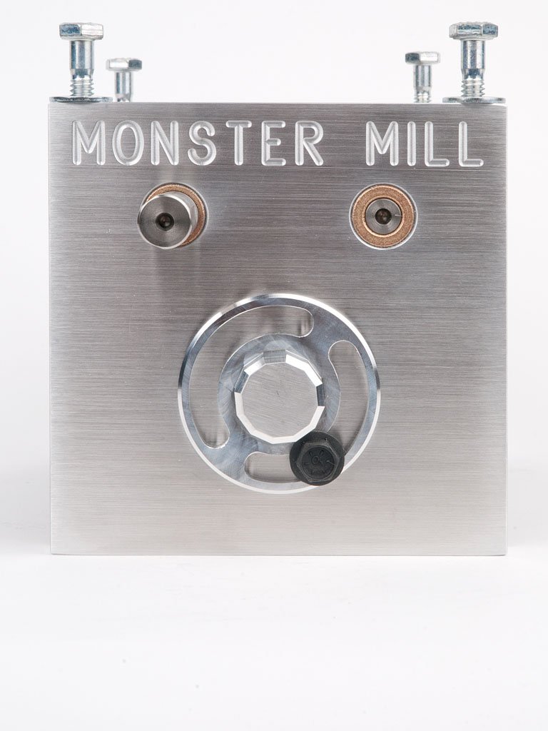 One knurled steel roller is driven by a standard electric drill (not included) to feed the grain through the initial fixed gap of approximately .065", and then through the adjustable secondary gap and crush the grist. Both ends of the non-driven top idler roller ride in bronze bushings that are pressed into the frames, while the second idler roller rides in bushings that are offset mounted in an adjustable knob. The billet knob is held in a fixed position by a black oxide bolt you can loosen to adjust the mill. This system provides an adjustment range of .065". Our new design knobs are milled from solid 6061 aluminum barstock for excellent durability. The flange has two semi-circular slots that allow you to attach the knob positively to the face of the aluminum frame. They have 12 sides for a positive grip.