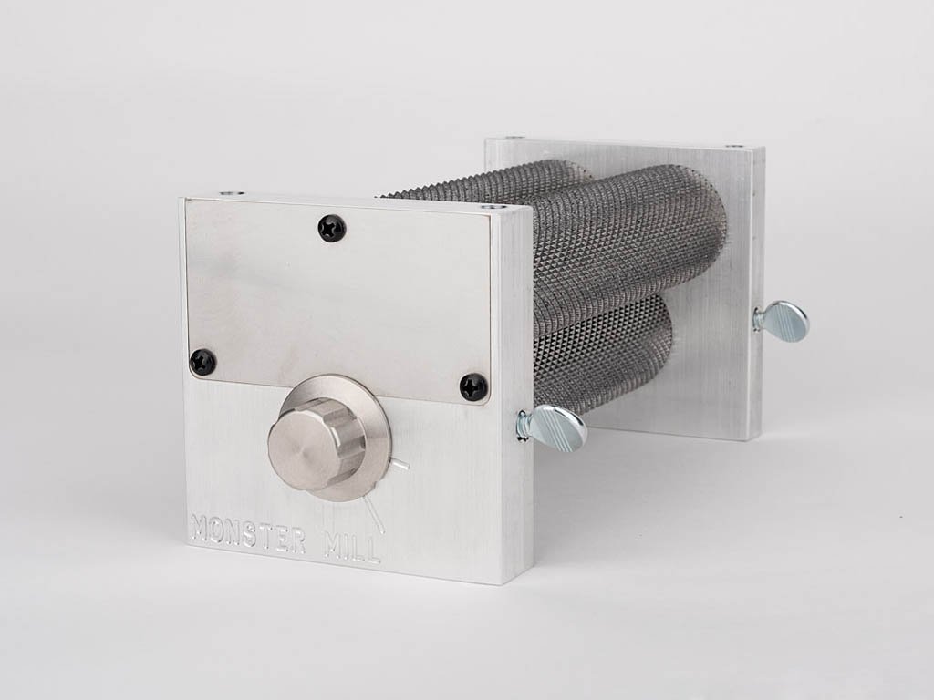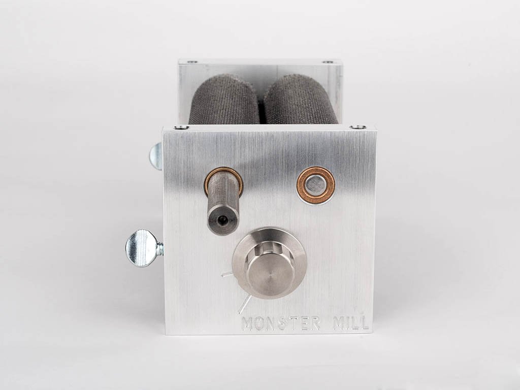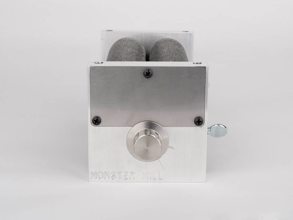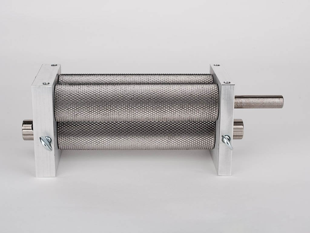 The MM-3G consists of 6061 aluminum block frames with three 6" long 1.5" diameter 1144 alloy steel rollers riding on Oilite™ oil impregnated bronze bushings, while the third idler roller rides in bushings that are offset mounted in an adjustable knob. The stainless steel knob is held in a fixed position by thumbscrew that you can loosen to adjust the mill. This system provides an adjustment range of .070". The knobs are turned from solid 303 stainless steel barstock for excellent durability. The skirt flange has a small cookie bite aligned with the eccentric offset that allows you to know how your offset adjustment is aligned. They have additional slots for a positive grip. For the rollers we use a superior grade of steel that is much harder (1144 alloy) than what is found on most comparable products. The drive shaft, and all the axles are integral to the roller rather than screwed into the ends. All the axles have minimal freeplay in the bushings for long lasting reliable life. This mill comes standard with the 1/2" drive shaft. We recommend a name brand corded 1/2" drill to turn this mill. Wimpy house special weak drills will release the smoke from the load. Suitable for the most discriminating serious hard core home brewer that wants the very best, the MM-3G is our flagship homebrewer model, the best of the best.