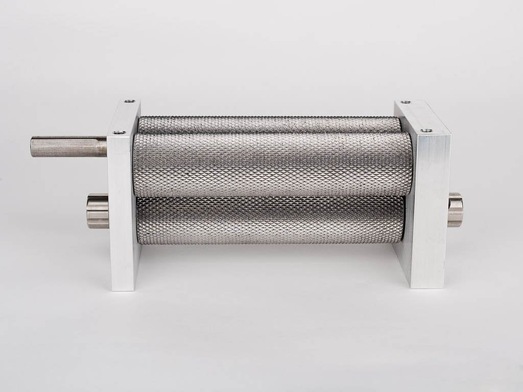 - three six-inch steel rollers form two gaps, a preliminary fixed gap of approx .065", and a fully adjustable secondary gap.