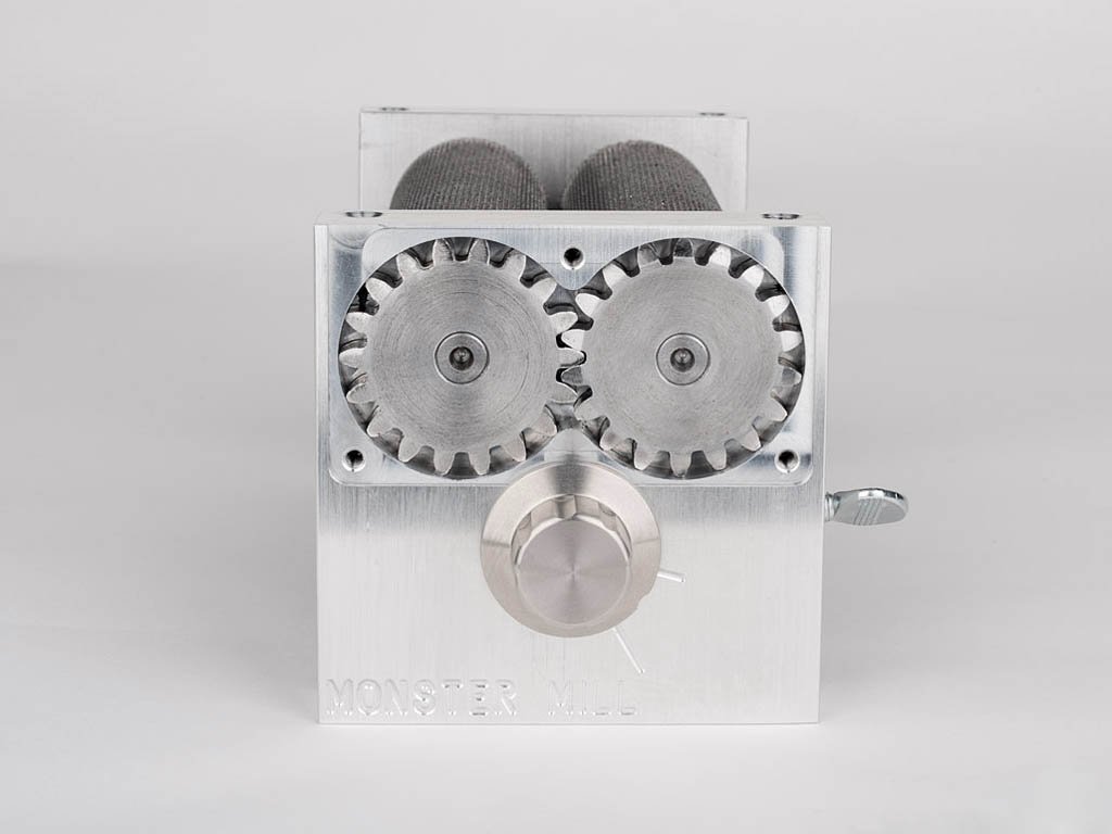 Its finally here. We have added gears to the already successful MM-3 to create the new MM-3G. Basically a scaled down version of the already famous MM-3ProG. This mill is NOT suitable for commercial applications including brew shops or commercial breweries. For commercial applications look at our Pro series mills.DO NOT run this mill backwards under any circumstances, you MUST turn the drive shaft ONLY clockwise to feed grain down into the gap. The drive shaft spins one top roller that drives the other top roller through a set of alloy steel gears. Grain from the top fixed gap is force fed to the adjustable gap between the main drive roller and the bottom third roller. Super reliable feeding is now a given for your hard core homebrew operation. The most advanced in our line of 3-Roller Home Brewing Monster Mills, The MM-3G is a further upgrade of our already successful MM-3. The MM-3G comes standard with two 1215 alloy steel gears driving two 1.5" diameter 1144 alloy steel rollers, with a third idler roller providing a second crush through an adjustable gap, solid 303 stainless steel knobs, as well as the 1/2" drive shaft with three flats for drill drive. The rollers are 6" long just like all our home brewing mills. With all the great features of our already popular MM-3, but with gears for positive feeding. The MM-3G crushes all your grain twice, with one pass through the mill. It starts with a preliminary crush through the initial fixed gap of 0.070” between the top two rollers, and then ends with a pass through the adjustable second gap (0.028->0.055) between the drive shaft roller, and the bottom third roller. The initial pass slightly flattens the grain, and gets it ready for the next crush, that breaks apart the grains and loosens the starch with minimal husk damage.